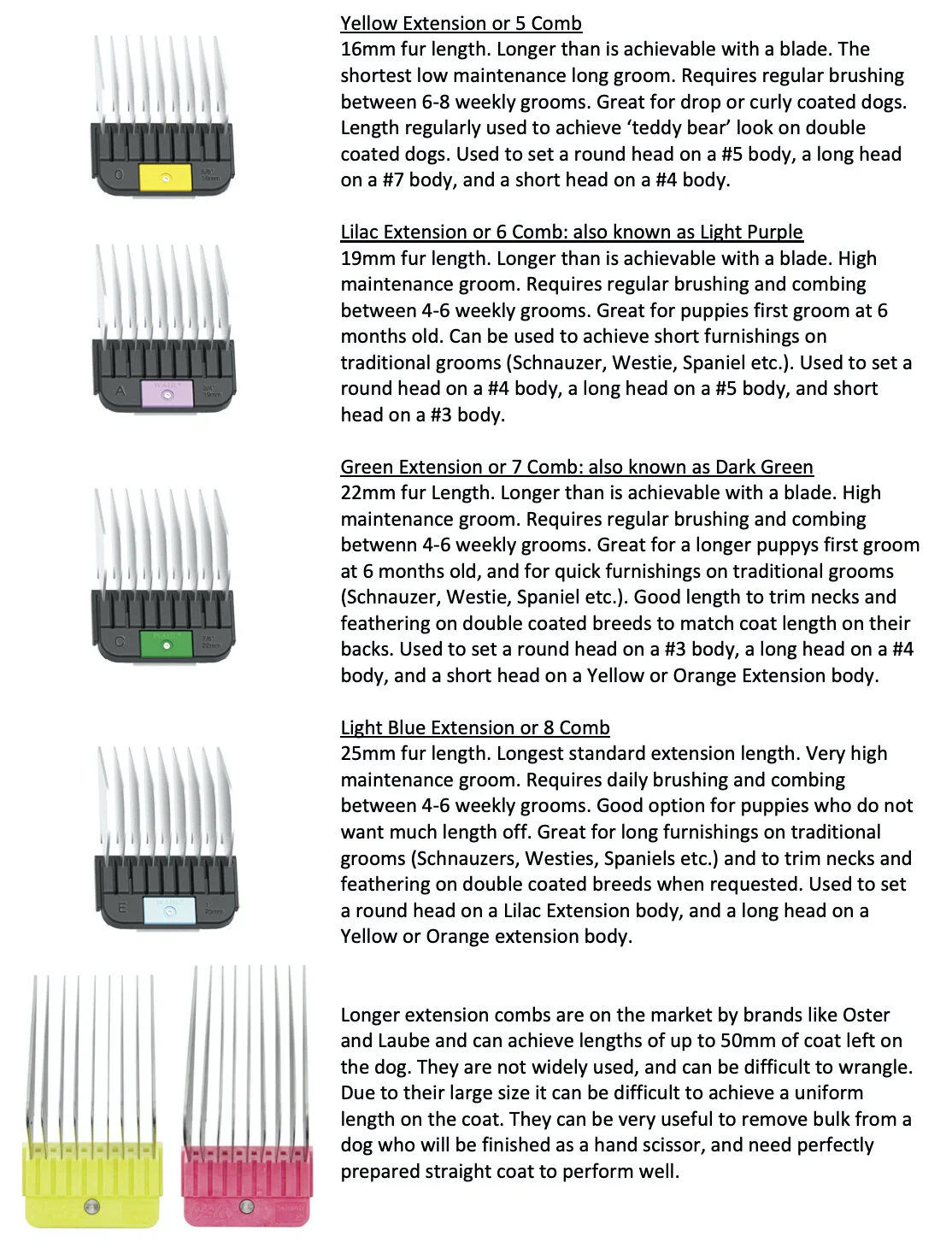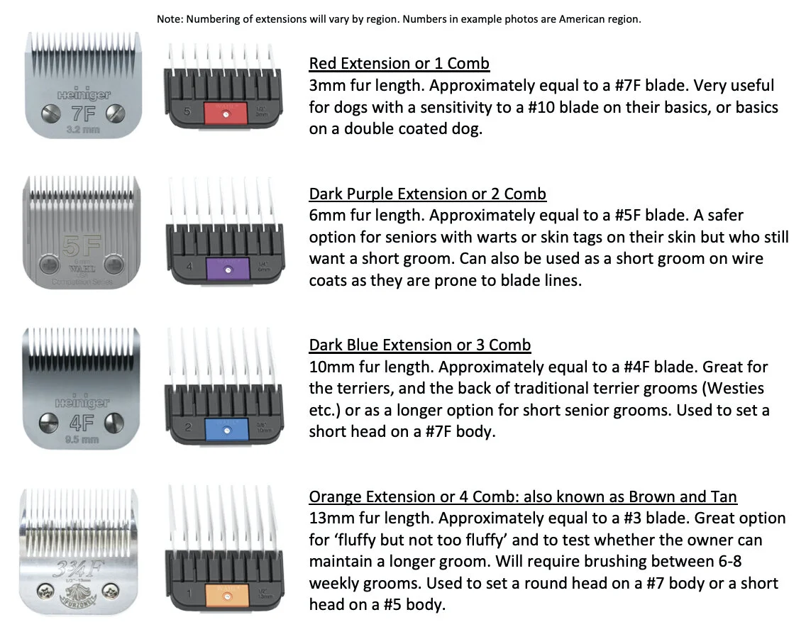 Knowing the approximate lengths of each extension and which blades they can be compared to will help with choosing which one you should use on a dog. You will find that most of the time the extension will leave the coat slightly longer than the blade - due to the different mechanisms they use to cut. Where the blade raises the fur up from the skin and feeds it into the cutter, the extension cuts the fur as it sits on the body.