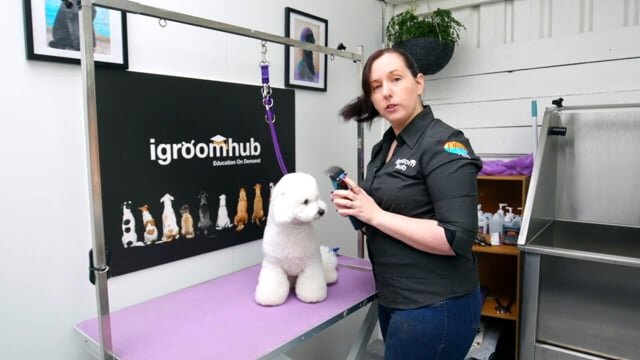 Michelle and Rocket (a Bichon) show how to acheive the classic shorter body and flared legs popular with Asian Fusion grooming. Bedlington ears plus bling to finish really elevate this groom!