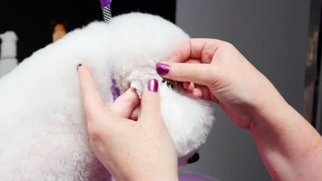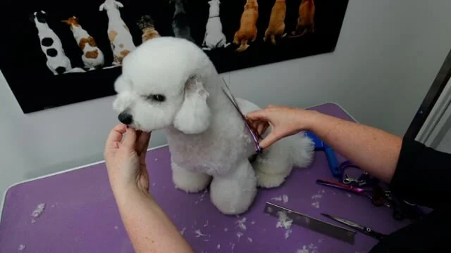 Part 2 Cutting in Bedlington Ears using a #30, and which danger points to look out for. Using reverse curved scissors and thinners to soften the Bichon expression to get the perfect Asian Style head, ending with a smiley under-jaw.