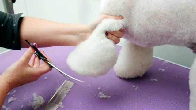 Prep areas like the groin, pads, and coat with thorough brushing for a smooth, groomed look.