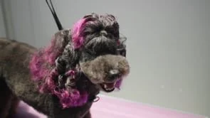 Part 2 With the curling section complete for now, Michelle sculpts Logan's body into a Schnauzer like pattern using a blue extension.