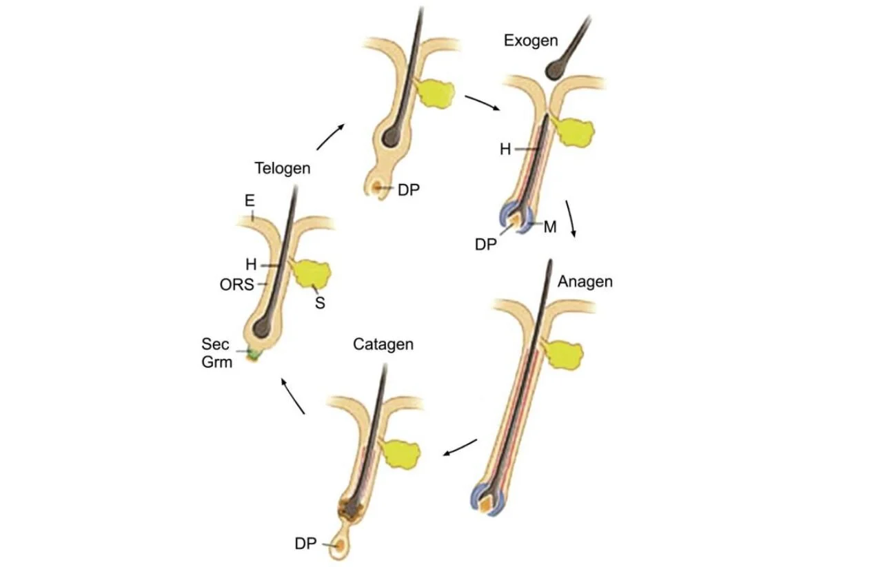 The hair cycle is divided into three main distinct phases, themselves interspersed with intermediate phases. The first one is the anagen phase is the growth phase of the hair. The intermediate phase or catagen is the phase of degeneration. Finally, the telogen phase is also called the rest phase. In this last phase, the hair does not evolve anymore, it waits for another hair to enter the anagen phase and expel it from the follicle. Once a new phase starts, the hair is expelled of the follicle, this is called the exogen phase. This sequence of anagen, catagen, telogen and exogen is defined as the hair growth cycle.