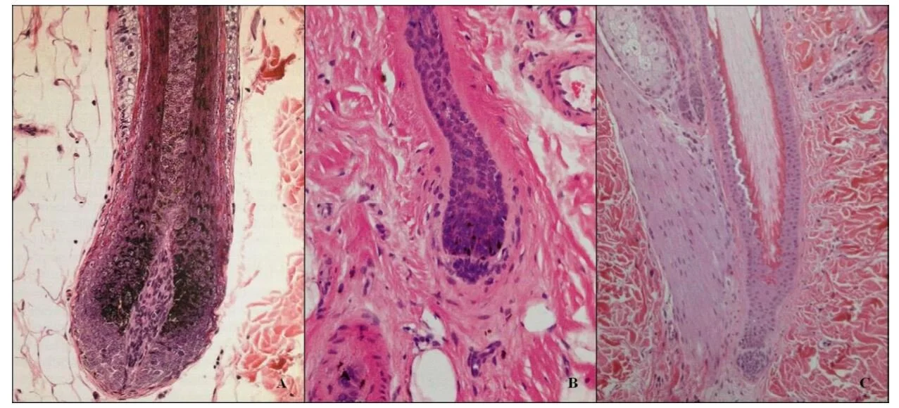 Figure 5 Histologic pictures of an anagen (a), catagen (b) and telogen(c) follicle. A. Anagen follicle. Note dermal papilla, matrix with melanocytes. B. Catagen hair bulb with dermal papilla, prominent basement membrane and epithelial strand. C. Note telogen hair follicle with club hair and trichilemmal keratinization (white arrow). Prominent basement membrane separating dermal papilla (black arrow) and secondary germ. Adapted from Mecklenburg, 2009.