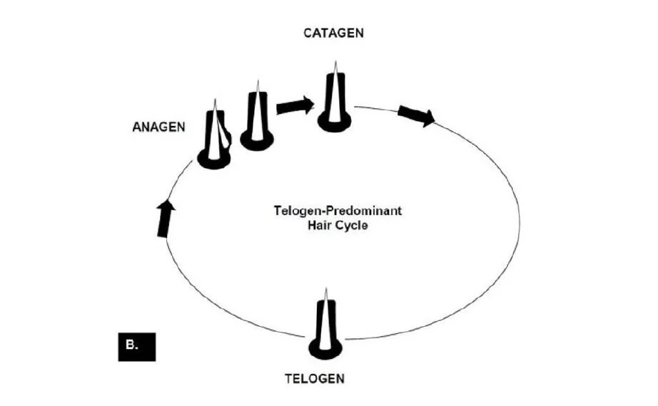 Most of the breeds are telogen breeds, they have a genetically predetermined length of hair. Once this length is reached, the hair stops growing and enter into telogen phase. The telogen phase is then very long and will last until a new anagen phase starts. This new anagen phase usually starts with a new shedding. In some breeds, such as the Nordic breeds (Husky, Malamute, etc.), the telogen phase can be very long and lasts up to 12 years approximately (the whole life of the dog) (9).