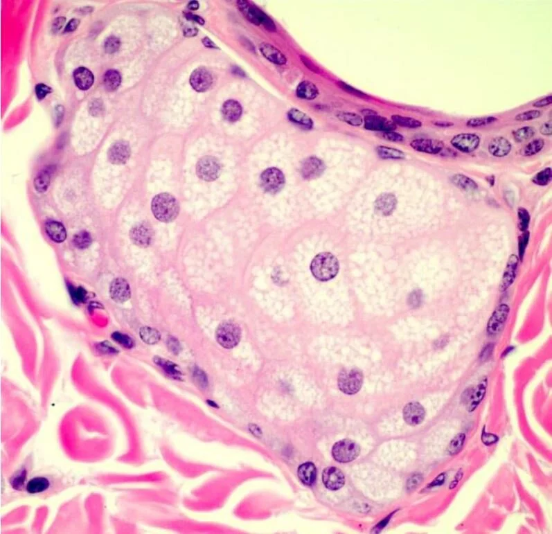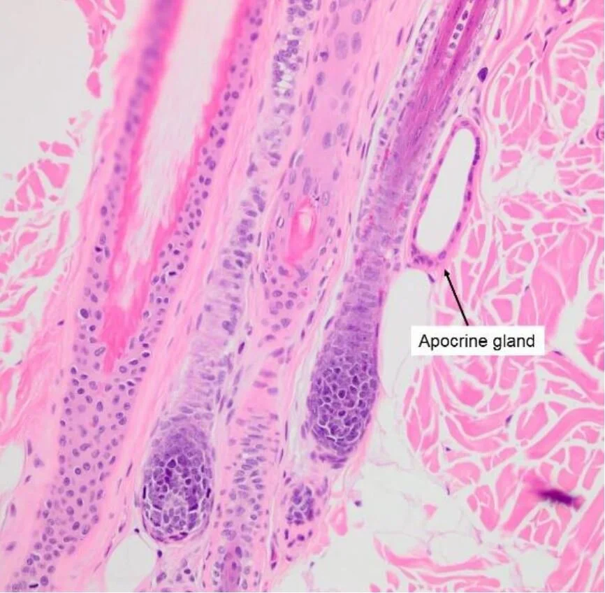 FIGURE 7: DERMAL ADNEXA, DOG. APOCRINE GLANDS ARE ASSOCIATED WITH HAIR FOLLICLES, AND AS SUCH, ARE REFERRED TO AS EPITRICHIAL GLANDS.