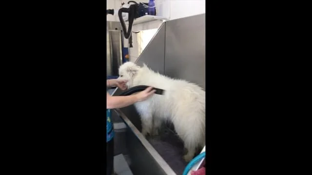 The best way to groom is after two very thorough washes with a quality shampoo, and condition so the dog is really clean. Use a force dryer and nearly 'over dry' the dog. At about the ¾ drying point use a slicker brush then comb as you are drying (refer to the Samoyed drying video).