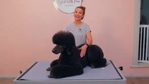 Your dog must stand “square” at all times while being trimmed. If your dog is sitting and you think that’s okay because you’re just trimming the front, the result will be that your front trim will turn out wrong as it will be unbalanced. I also like to have my poodle standing with their tails up because it teaches them that their tail should be up when I’m working on them. It helps balance the outline in my eye, as I’m working on them. In the video shown here, the poodle is being held on a grooming arm and grooming loop. You will notice that the loop is not tight and the dog is not leaning into it in any way. It is simply there for safety reasons. I usually groom my poodles with no grooming arm or loop. I feel that if you teach your Poodle how to hold it’s shape on the table, your trim will turn out better AND when it comes time to show your Poodle, it is easier to transfer that shape onto the floor while showing them. This is how to get the best results.
