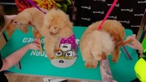 These two liitle dogs have already been high velocity dried. This next step is about spending five to ten minutes fluff drying to properly straighten the coat before scissoring.