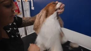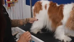 • 08:14: Concluding the grooming session for Tigger the Cavalier, a neuter champion, ready for the ring.