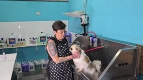 You’ll see the full bath and dry, including Tepra’s in-bath de-shedding technique that keeps your washroom cleaner and your dog’s coat in better condition. A great peek behind the scenes that sets the stage for the full groom.