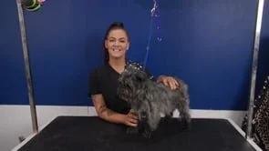 Today, Alicia is grooming Buddy, a lively 9-year-old, who’s getting a pet trim with a spray-up. For this look, Alicia will use a #4 blade on the body, a 19mm extension on the cape, and will scissor the shape of the cape and legs for a polished finish.