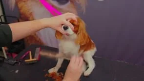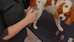 Daisy is a sweet, rescue Cavalier who is owned by the presenter, Michelle. She prefers to have her head down while being groomed and is not in any discomfort or stress.