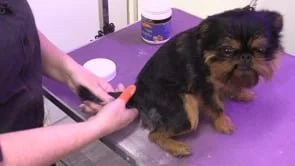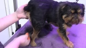 Cec is a lovely example of a Brussels Griffon. Chuckie uses a #5 skip tooth blade on the body and styles the traditional head. Be prepared with your handling notes—this one is a live wire! Watch how Chuckie gently controls Cec when she becomes restless.