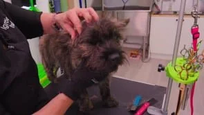 Prue is a brindle Cairn Terrier and is being hand stripped into a show trim by Chuckie. Prue is 9 months old and already an Australian champion! The tools used today are a stone, rake and detailer.