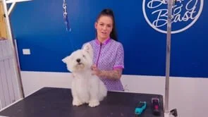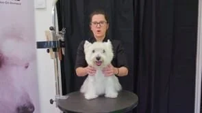Nicky completes a Westie pet trim head to match with a pre-clipped body. She uses a layering technique to achieve a cleaner finish on what is typically a rougher looking cut.