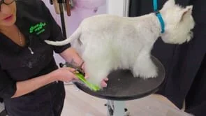Poppy is a much loved pet and is having a #6F wide blade trim. This demonstration by Alicia showcases a pet style trim on a Westie with an optional spray up on the head at the end for a sleek finish.