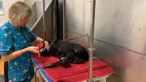 Use a high-velocity dryer to remove excess water initially; then use a handheld dryer to straighten the coat fully.