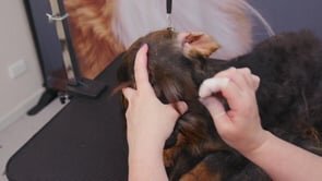 For eyebrows, shape by removing excess hair to achieve a bushy look as per breed standards.