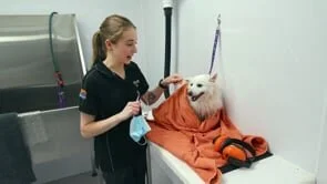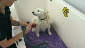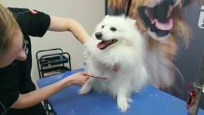 Jess and Hoshi go through the de-shed and tidy process for you. Hoshi has a dense coat, and it has been 3 months since his last deshed. Starting with a very clean dog is essential - watch for the correct bathing techniques. Afterwards, dry the skin first and then release the dryer nozzle out from the coat. Always be sure to monitor the dog closely during this process and ensure the heat is not drying out the skin - there’s a difference between drying and drying out! Line brush every section with slicker, then comb with OMG spray.