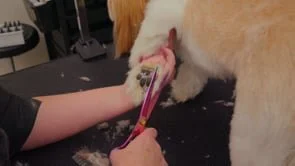PART 3 The front and back legs. Michelle checks in on Mishka's behaviour during the leg and feet work. The Groomers Helper can be handy if you are grooming on your own. Michelle chooses to scissor rather than clip her legs so it is easier on Mishka.