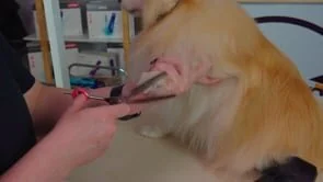 PART 1 Andy is sporting an outline trim, or a silhouette trim. Colleen is using igroomhub’s curved chunkers and thinning shears. In this video, she demonstrates starting with the feet and blending into the pants.