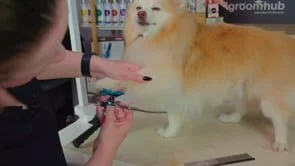 Introducing Andy, the rescue Pom x Spitz. Andy is 13 years old and is having an 'outline' trim. Colleen demonstrates how to achieve a polished, hair free outline trim. Andy is pre-bathed in ProGroom 2 in 1 shampoo, and spritzed with ProMagic spray while drying.