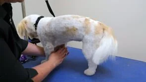 Mia is a cute Maltese cross. Mia has what we call 'Queen Anne' legs. This is common in Maltese and Shih Tzu cross breeds. Care must be taken when working around these legs to avoid discomfort to the dog. Chuckie demonstrates a gentle pet trim, with all her little tips and tricks for maintaining the comfort of the dog, and hiding the not so perfect areas of Mia (if we can be so bold!)
