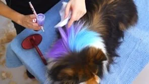 Ombreé all day! Rocket gets a little dye touch up from Michelle to restore his vibrant violet ombré tail. If you are thinking of dying your dogs, preparation is key! Wash your dog beforehand, but do not use a conditioner.